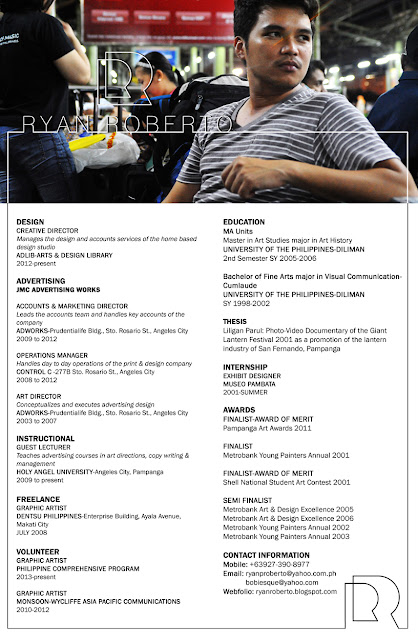 Ryan is an alumnus of the University of the Philippines (UP) College of Fine Arts in Diliman. He graduated cumlaude with a degree in Bachelor of Fine Arts major in Visual Communication.He took some units in Master in Art Studies major in Art History at the College of Arts and Letters also in UP-Diliman. He took a LOA to seriously think about what he really wanted in life, attended a Bible Seminary, went to Singapore and came back to the Philippines to fulfill his life purpose. He used to work as the Head Artist of JMC Advertising Works (Adworks) in Angeles City. A finalist in Metrobank Young Painters Annual in 2001, his work entitled Leaves IV: Melancholia according to Dr. Rod Paras, an art historian is an emphatic visual statement that relies on nature in expressing human emotions. He also writes short stories and independently publish them for friends. His work include "Stories in the Shadow". He is currently working as a freelance artist and serves as a youth leader in their church.